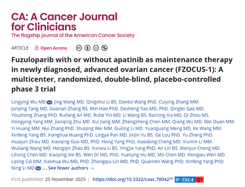2025年11月25日,九游会·J9医药自主研发的创新药氟唑帕利联合阿帕替尼或氟唑帕利单药用于新诊断晚期卵巢癌(OC)的一线维持治疗研究最新数据(FZOCUS-1研究)重磅在线发表于国际顶尖医学期刊《临床医师癌症杂志》(A Cancer Journal for Clinicians,简称CA,2024年影响因子高达232.4)1